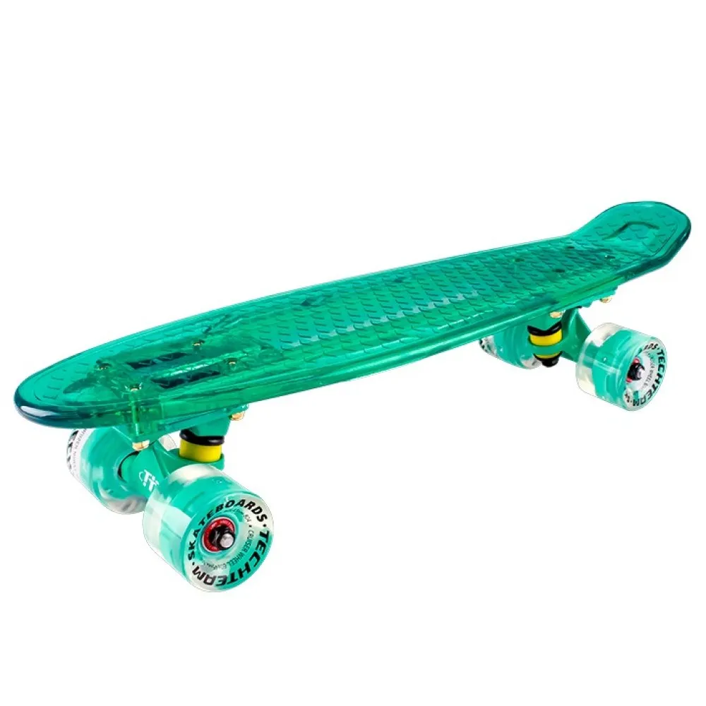 Подсветка встроенная не только в деку, но и в колёса, порадует глаз и не оставит равнодушными прохожих. Плюс ещё один бонус от производителя - это автоматически меняющийся режим подсветки, кнопка включения находится на обратной стороне деки. Литиевая батарея 420 mah обеспечит длительную работу подсветки. Скейтборд Transparent 22 light бирюзовый позволяет не просто передвигаться по городским улицам но и профессионально выполнять различные трюки.