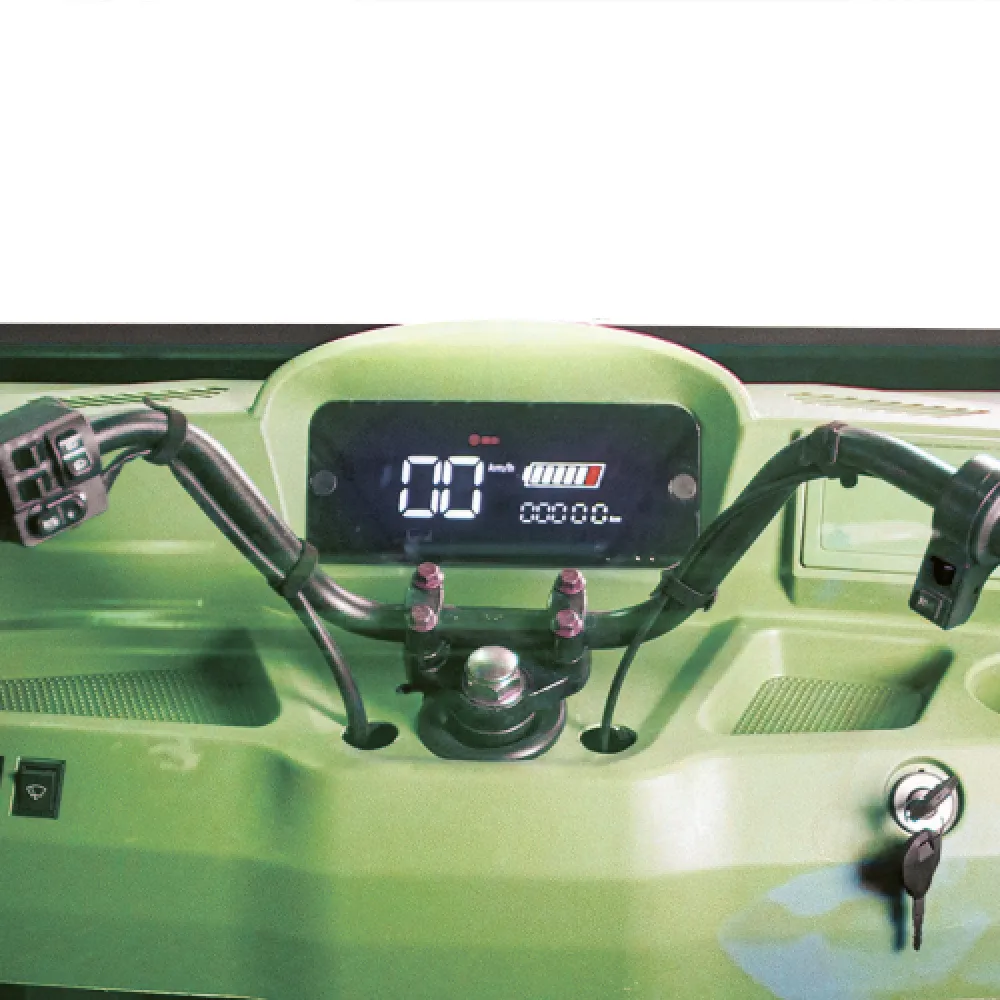 Модель оснащена современным тяговым бесщеточным новым мощным мотором с параметрами 1000 Вт. Такая начинка улучшает скоростные характеристики техники. Электротрицикл быстро развивает скорость до 25 км/час. Откидные борта кузова позволяют легко выгружать крупногабаритный груз. Герметично закрытая кабина допускает езду при любых погодных условиях, открывается с двух сторон.