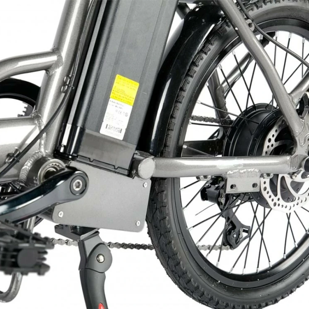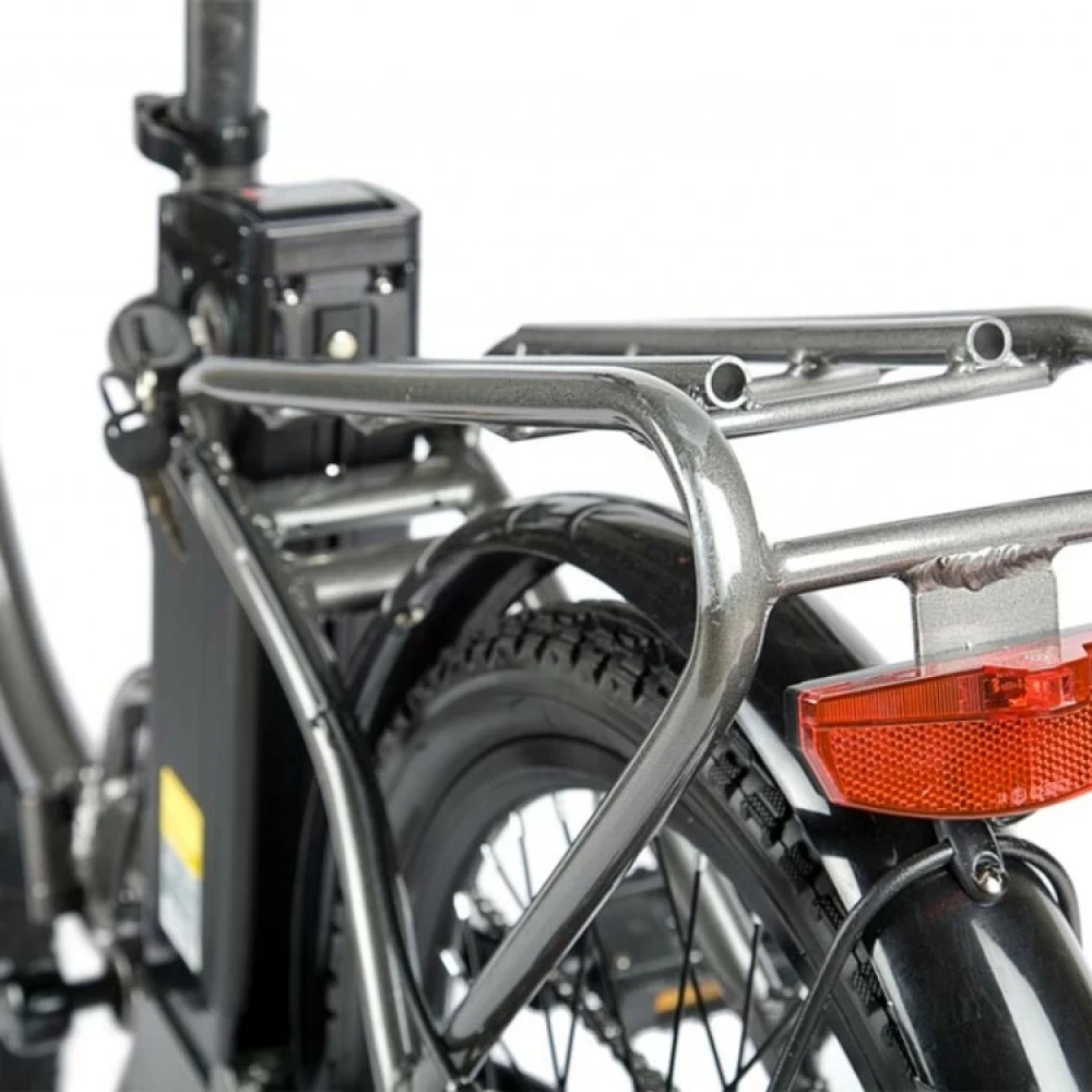 Алюминиевая конструкция рамы – складная, рассчитана на максимальную грузоподъемность до 110 кг. Благодаря современной системе трансформации техника в течение пары минут достигает минималистичных размеров. С такими характеристиками модель удобная как в путешествии, так и при хранении. При мощности электродвигателя 350 Вт и максимальном разгоне скорость составляет 30 км/час, а заявленный производителем запас хода – 60 км. Увеличить пробег можно посредством чередования электрического режима с педальным. Батарея размещена в недоступном защищенном месте за седлом, не мешает во время езды, быстро снимается и быстро заряжается (в течение 6 часов). Удобное регулируемое седло снижает нагрузку на спину, не вызывает усталости. Наличие подножки не вызывает проблем с парковкой. Контроль скоростных параметров и заряда батареи обеспечен информационным дисплеем. Для оформления заказа предлагаем сделать телефонный звонок нашему специалисту.